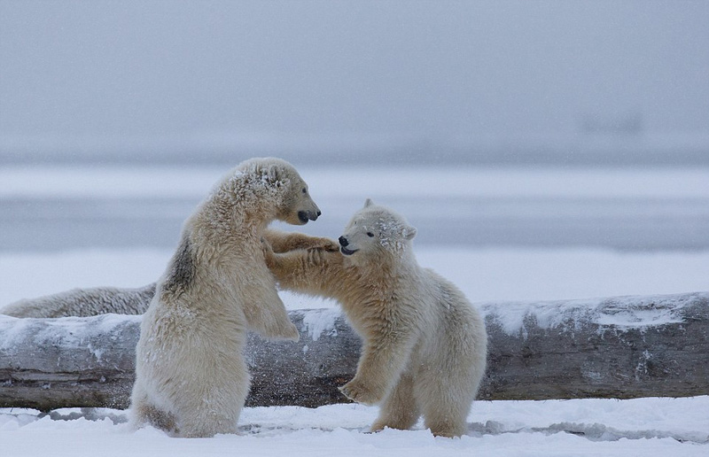 42岁的自然摄影师克里斯托弗 瓦瑟兰(Christophe Vasselin)在美国阿拉斯加州拍摄了一组北极熊搏斗的照片。小家伙们在倒下的树干周围跌倒,一只小熊爬到了树干上方,然后开始打架。过了一会,一只小熊把另一只推到地上后获得了胜利。