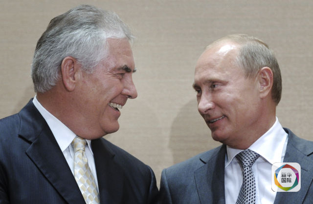 12月13日,美国当选总统唐纳德·特朗普宣布,他选定埃克森美孚公司首席执行官雷克斯·蒂勒森为国务卿。 这是2011年8月30日,雷克斯·蒂勒森(左)在俄罗斯索契与时任俄罗斯总理普京出席一个签约仪式的资料照片。(新华社/美联 )
