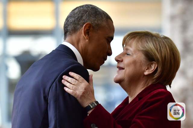 11月17日,在德国柏林的总理府,德国总理默克尔(右)欢迎美国总统奥巴马。 (新华社/法新 )