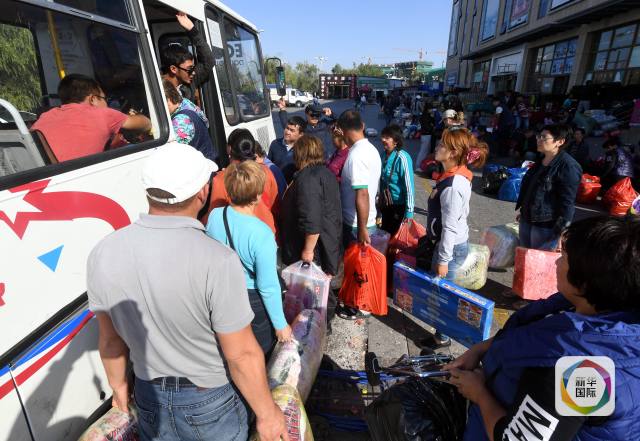 9月29日,哈萨克斯坦顾客在中哈霍尔果斯国际边境合作中心的商贸城购物后准备乘车出关。(新华社记者李晓果摄)