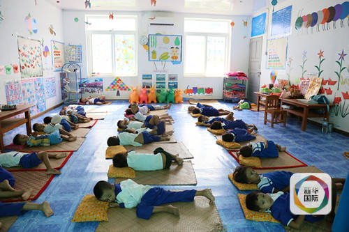 11月4日,在缅甸北部实皆省蒙育瓦地区,孩子们在万宝矿产公司为甘多村开设的幼儿园中休息。新华社记者韩新颖摄