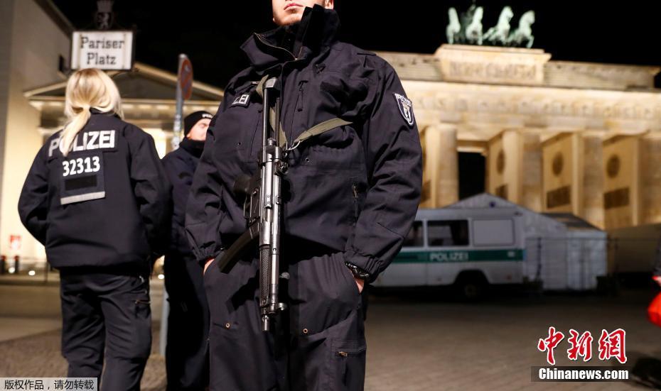 当地时间2016年12月27日,德国柏林,德国警方驻守勃兰登堡门附近,保证新年期间安全。