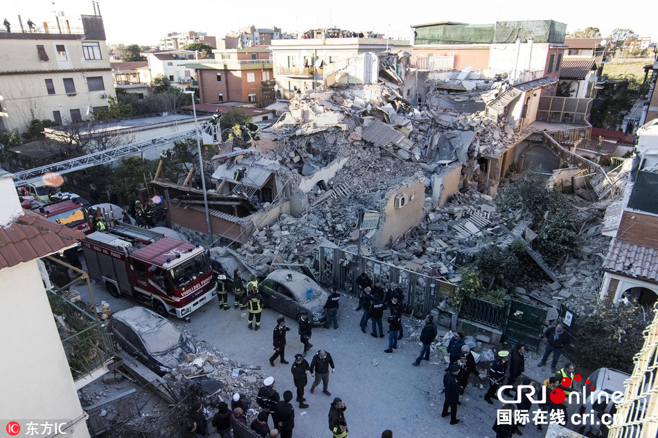 当地时间2016年12月28日,意大利罗马南部郊区的阿希里亚(Acilia)地区一两层楼疑因瓦斯泄漏爆炸倒塌,两人被从房屋废墟中救出。图片来源:东方IC