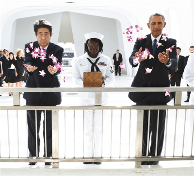 当地时间27日,日本首相安倍晋三与美国总统奥巴马一起,向珍珠港事件中遇袭沉没的美国亚利桑那号战舰残骸所在水域撒花,以表哀悼之意。图/视觉中国