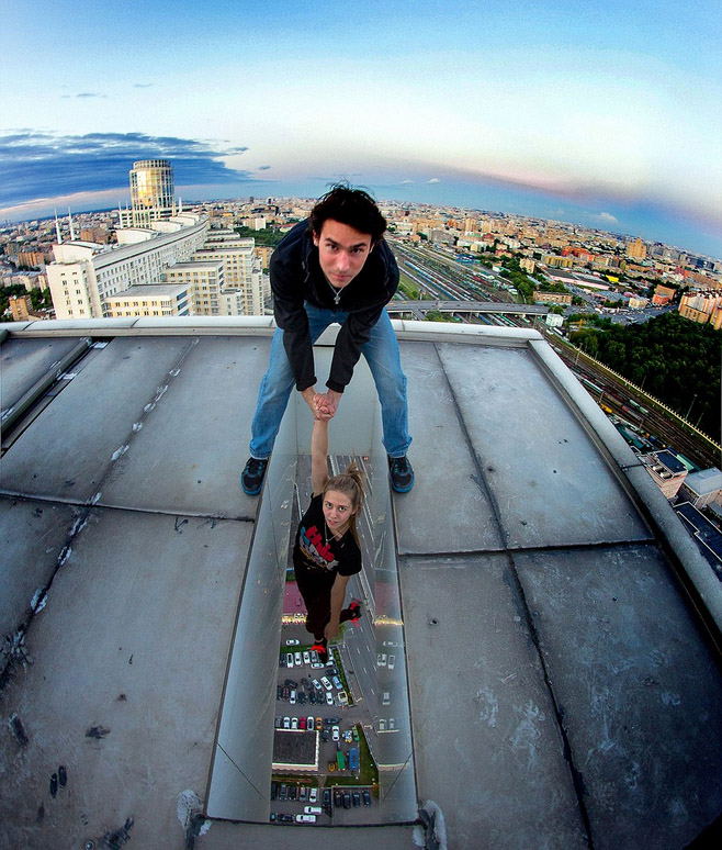 这绝对是考验两个人信任程度的最佳方式,男子伊万(Ivan Semenov)在莫斯科市中心一座高层建筑顶上,双手抓着自己悬空的女朋友拍照。