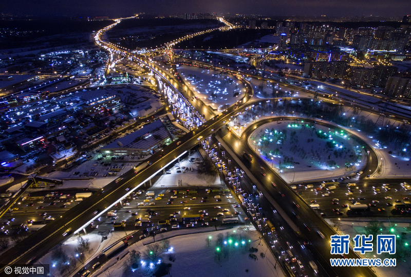 当地时间2016年12月27日,俄罗斯莫斯科,Varshavskoye高速路与莫斯科环城公路夜景。图片来源:视觉中国