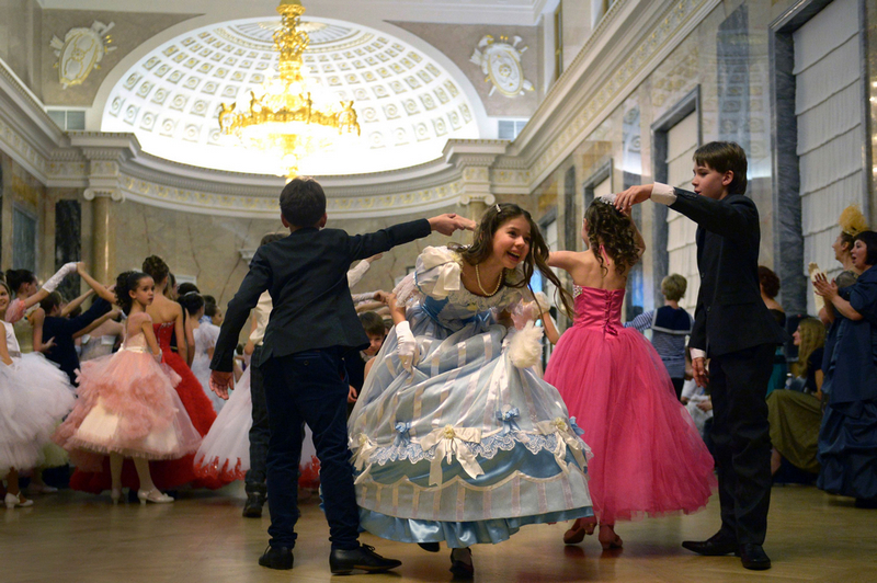 当地时间2016年12月27日,俄罗斯圣彼得堡,苏沃洛夫军事学校和海军学院学员以及瓦冈诺娃俄罗斯芭蕾学院学生参加圣诞节舞会。