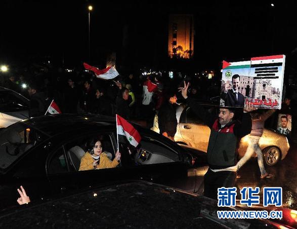 12月22日,在叙利亚北部城市阿勒颇,民众上街庆祝叙政府军收复该市。叙利亚军方当晚发表声明,宣布北部城市阿勒颇内剩余的反政府武装人员已全部撤出,叙政府军完全收复阿勒颇市。 新华社发(阿马尔摄)
