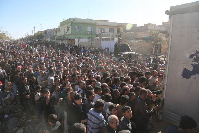 图为 11月20日,伊拉克摩苏尔市民等待领取救济物资。伊拉克特种部队当天护送救援物资抵达摩苏尔市部分被收复的街区。 (新华社记者刘万利摄)