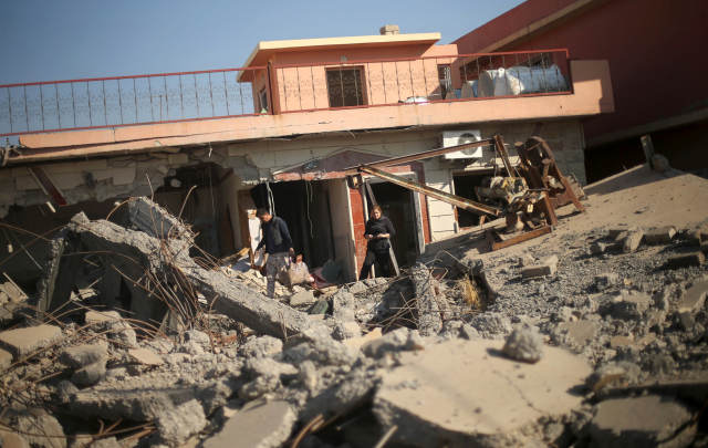 图为11月29日,在伊拉克摩苏尔北部的巴希加,人们查看被战火损毁的房屋。(新华社/路透)