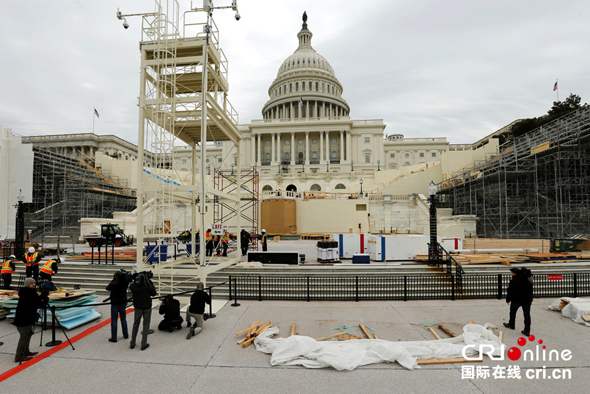 当地时间2016年12月8日,美国华盛顿,建筑工人在国会山搭建就职典礼台。第45届美国总统特朗普将于2017年1月20日正式就任。图片来源:视觉中国