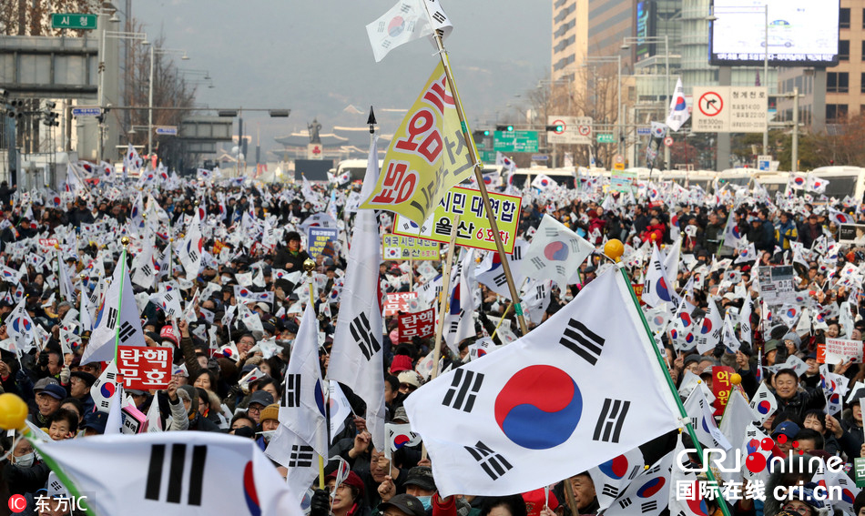当地时间2016年12月31日,韩国首尔,韩国总统朴槿惠支持者集会示威,抗议总统弹劾案,声称弹劾无效要求恢复总统职权。图片来源:东方IC