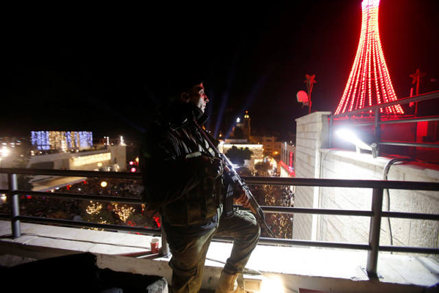 12月3日,在约旦河西岸城市伯利恒,一名巴勒斯坦士兵在圣诞树亮灯仪式进行时警戒。(新华社发)