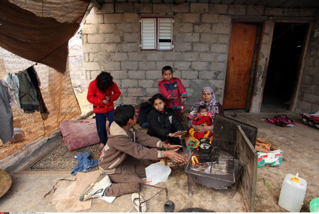 12月14日,在加沙地带南部汗尤尼斯,巴勒斯坦民众在火炉旁取暖。(新华社发)