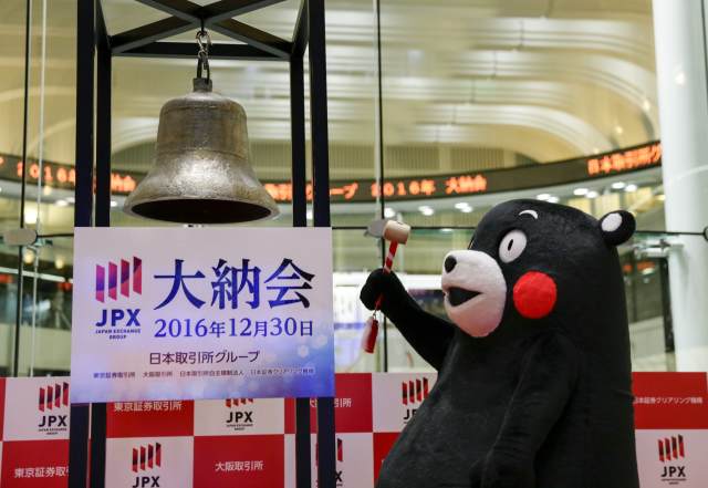 2016年12月30日,日本首都东京,熊本县官方吉祥物“熊本熊”在庆祝东京股市2016年最后一个交易日的仪式上敲钟。 (新华社/欧新)