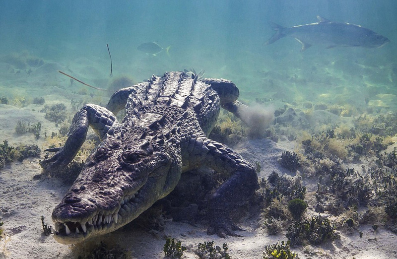 他拍到的令人称赞的照片展示了鳄鱼巨大的下巴和尖锐的牙齿,给人们带来了前所未有的骇人的视觉冲击。克里斯蒂安说他太专注于拍摄精彩的照片以至于忘记了害怕。在开始一天的水下拍摄工作前,他接受了一些专业训练。他说把动物引诱到沙底长满海草的区域,它们不易发动攻击,然后就等鳄鱼靠近他的时候拍下照片。