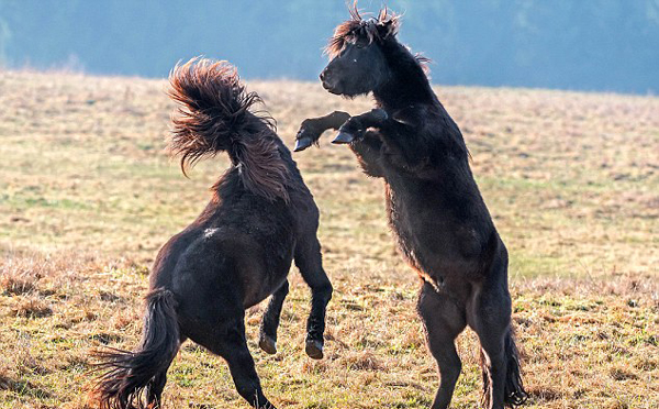 据英国《每日邮报》12月29日报道,在德国中部的韦斯特林山区,63岁的摄影师英戈·格拉克(Ingo Gerlach)拍摄到了一组两匹冰岛种马打斗的照片。据悉,这两匹种马是为了争当该领域的头马而展开了激烈的霸权争夺赛。