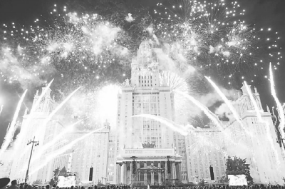 2011年9月4日,俄罗斯莫斯科,莫斯科国立大学主楼的映射表演"Alfa Show 4D"。光明图片/视觉中国