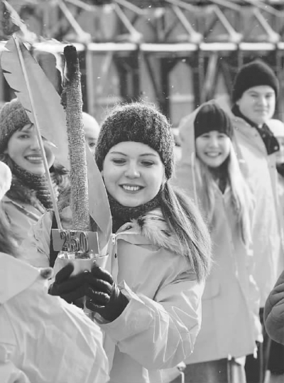 2005年1月26日,俄罗斯莫斯科,大学生参加火炬接力活动,庆祝莫斯科国立大学建校250周年。光明图片/视觉中国