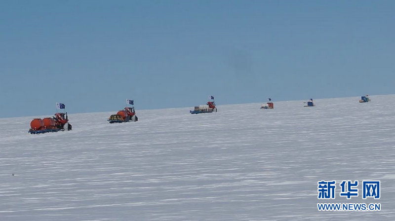 中国第33次南极科考队昆仑站队向内陆行进。行程1260km,用时16天,克服了暴风雪、白化天等恶劣自然天气,经历了车辆故障、冰裂隙等艰难险阻,于12月30日13时顺利抵达中国南极昆仑站。昆仑站队特约通讯员 张楠 摄