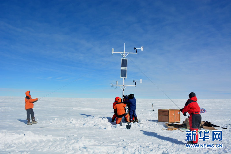 在南极内陆冰盖,距中山站1100km处,昆仑站队科考队员正在架设南极内陆冰盖自动气象站,监测南极内陆气象变化情况;昆仑站队特约通讯员 张楠 摄(2016年12月28日)