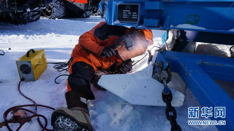 昆仑站队后勤保障队员正在极其寒冷的环境里维修损坏的雪橇。昆仑站队特约通讯员 张楠 摄(2016年12月18日)