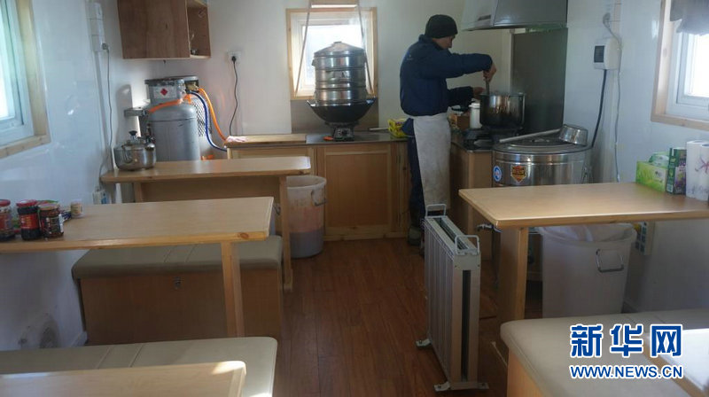 内陆生活舱内,昆仑站队厨师正在准备全体队员餐食。昆仑站队特约通讯员 张楠 摄