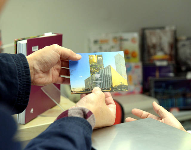 1月4日,里斯本一邮局一顾客展示纪念古特雷斯就任联合国秘书长首日封及邮票。(新华社记者张立云摄)