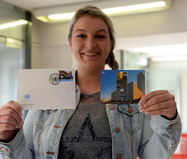 当日,葡萄牙邮政公司在全国发行了一枚首日封和两枚面值分别为0.8欧元和2欧元的邮票,纪念古特雷斯就任联合国秘书长。两枚邮票的图案分别是古特雷斯与难民会面及在联合国会议上发言的场景。