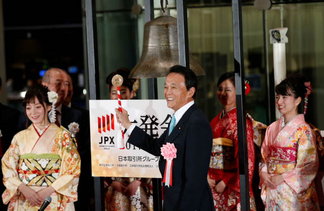 1月4日,在日本东京证券交易所,日本副首相兼财务大臣、金融担当大臣麻生太郎在新年开市“大发会”上准备敲响开市钟。(新华社/路透)