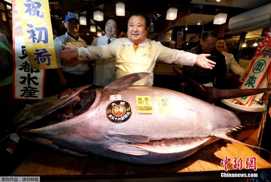 当地时间2017年1月5日,日本东京,筑地水产市场迎来了2017年的首个交易日,在开市前就有不少客人来预定这里著名的蓝鳍金枪鱼,而其中最大的一条金枪鱼被寿司连锁店“寿司三昧”的老板Kiyoshi Kimura拍得,这条重达212公斤的蓝鳍金枪鱼成交价为7400万日元(约4370000人民币)。图为“寿司三昧”老板Kiyoshi Kimura在他的门店前向顾客展示这条巨型金枪鱼。