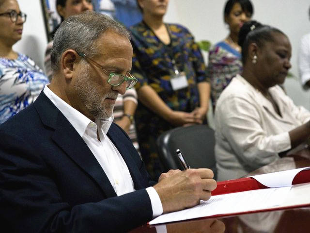 1月5日,哈瓦那,Coabana贸易公司主管斯科特·吉尔贝在木炭交易合同上签字。(新华/美联)