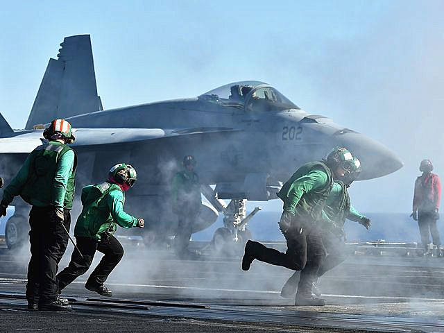 美军“艾森豪威尔”号航母,甲板人员跑向岗位。(新华/法新)