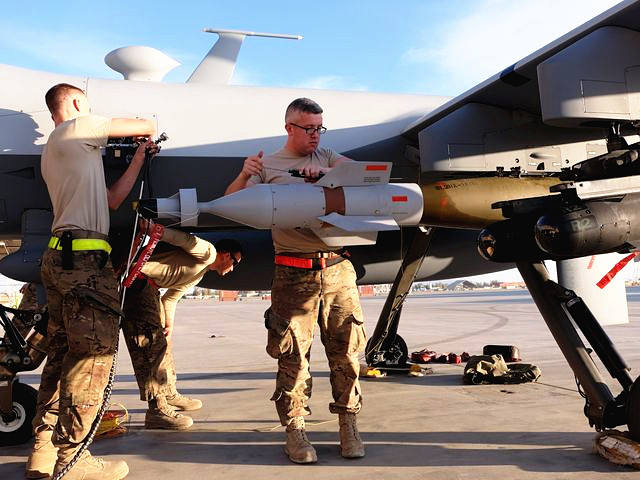 坎大哈机场,美军士兵给无人机装载导弹。(新华/美联)