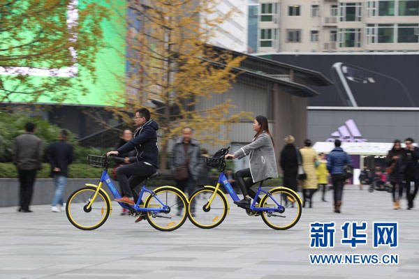 两名市民在成都市纱帽街骑着共享单车出行。新华社记者江宏景摄。