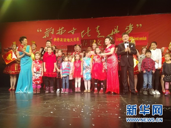 1月7日,在丹麦奥胡斯,来自湖北艺术团的演员与丹麦小观众同台献艺。新华网发(任俊摄)
