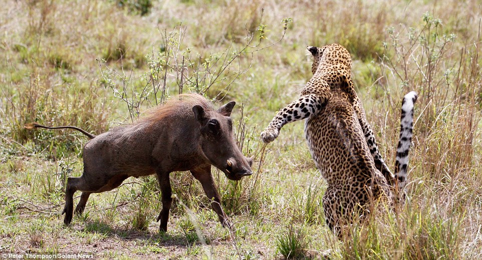 豹子可以跳多高?怀孕母豹“飞”向疣猪(组图)