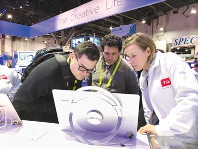 在今年的拉斯维加斯消费电子展上,中国企业带来的产品和技术受到广泛关注。图为两名参观者在向TCL展厅工作人员咨询Xess创逸移动大屏产品。人民日报记者 廖政军摄