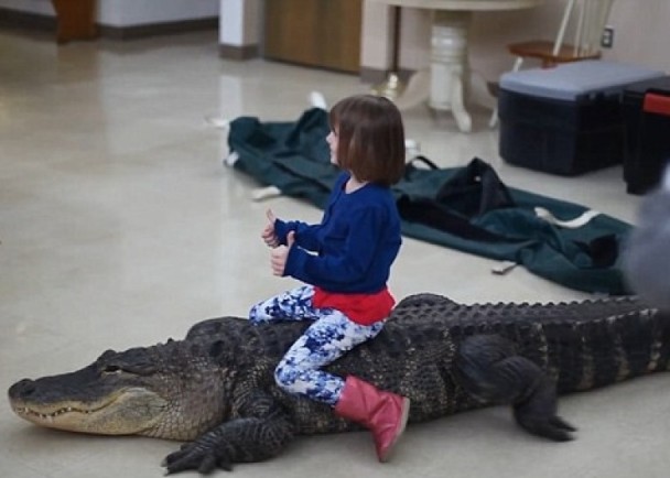 影片可见,小女孩似乎无惧这条身型比她还要大的短吻鳄,在指导员的陪同下,骑在它身上游玩。小女孩似乎不亦乐乎,而其父母则在一旁拍照留念。原来这条短吻鳄是由芝加哥一个爬虫动物协会所提供,目的是为家庭提供平常难以接触到的爬虫类动物,以教导孩童保育动物。据悉协会还有乌龟,甚至蛇供应。