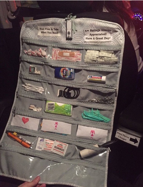 据英国《每日邮报》1月9日报道,近日,国外一名乘客在乘坐一辆优步(Uber)专车时发现车内竟然备有薄荷糖、药品及许多女性用品,更令人惊讶的是,所有物品都是免费提供给乘客的。