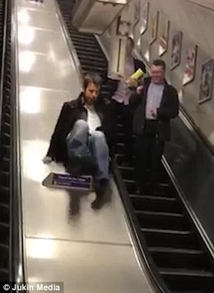 玩砸了!醉酒男子从电梯中间滑下时摔倒(组图)
