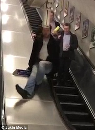 玩砸了!醉酒男子从电梯中间滑下时摔倒(组图)