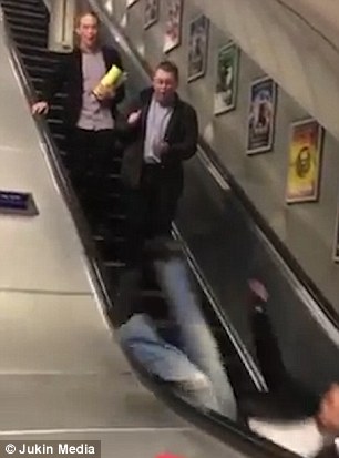 玩砸了!醉酒男子从电梯中间滑下时摔倒(组图)