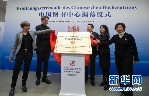 1月11日,在瑞士苏黎世大学,中宣部副部长、国务院新闻办主任蒋建国(右三)等嘉宾为“中国图书中心”揭幕。在习近平主席出访瑞士前夕,中国国务院新闻办公室在瑞士举办系列文化出版交流活动,瑞士冬日严寒大地上飘起了浓浓的中国书香。1月9日,由中国国务院新闻办主办,中国外文局、上海新闻出版发展公司承办的中国主题图书全球新年展销月活动在瑞士日内瓦拉开帷幕。此外,瑞士首个“中国图书中心”揭幕仪式11日在苏黎世大学举行。新华社记者 徐金泉 摄