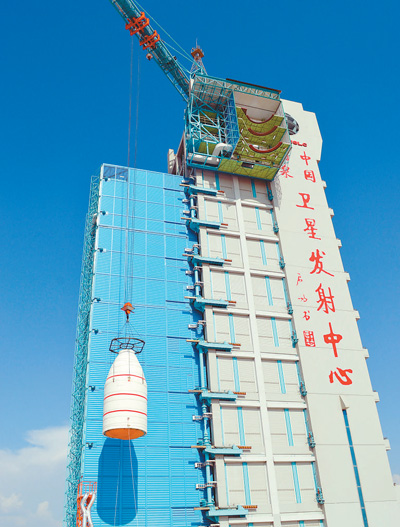 2016年8月,在酒泉卫星发射中心,量子卫星“墨子号”星罩组合体吊装,与运载火箭对接。新华社发