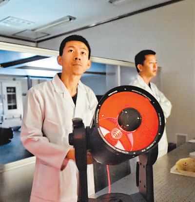 科研人员模拟地面望远镜向量子卫星发射信标光。新华社发