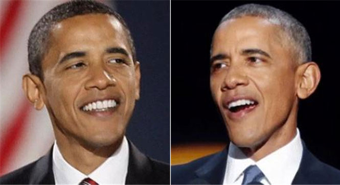 当地时间1月10日晚9时许(北京时间11日10时许),美国总统奥巴马将在芝加哥向美国人民发表被白宫称为“向前看”的告别演说,宣告8年总统生涯走向结束。左图为奥巴马2008年发表胜选演说时照片,右图为告别演说照片。