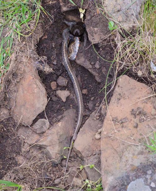 在一块岩石下面,他们发现一只约手掌大小的Grammostola狼蛛正在进食一条长约15英寸(约合0.381米)的阿尔马登地面蛇的尸体。