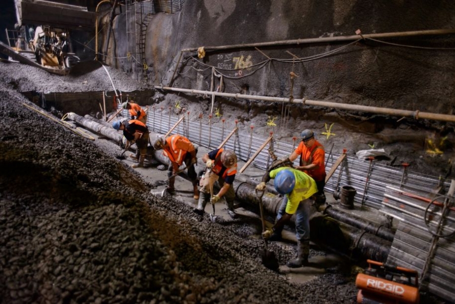 地铁施工是从下往上挖。工人使用炸药、重机械、还有一台巨大的22英尺宽隧道钻孔机(每天能挖大约66英尺)清理岩石。然后筑起墙壁,加装隔绝材料,使用一种复杂的隔膜系统更好的控制地铁施工最大的天敌 —— 渗水。为了弄清楚往哪里挖,要怎么挖,设计者参考的是一张最早由艾格伯特·维勒(Egbert Viele)于1865年绘制的地图,上面详尽的绘制出了曼哈顿岛下方纵横交错的排水系统。图为2013年施工现场。地铁施工团队和矿工团队其实没有太大区别,只不过他们是直接在曼哈顿街道下作业。图片来源:德雷克·米德
