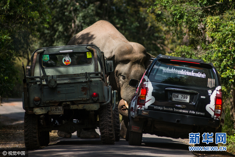 2017年1月11日,泰国考艾国家公园,一只大象在过马路时遇到了障碍物而不满,于是这只3岁大的亚洲象举起了一辆卡车并将其挪走。原来,公园的工作人员担心大象惊扰游客,试图用一辆丰田卡车堵住这只“庞然大物”。31岁的摄影师Chalit Saphaphak拍下了这些有趣的图片。图片来源:视觉中国